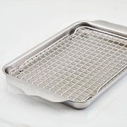 INCOMPARABLE BEAUTY - baking pan with stainless steel rack boasts a brushed stainless steel baking surface and polished exterior that brings a sleek look to the modern kitchen.