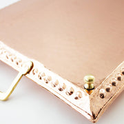 Inspired by a true Coppermill favorite, an antique “John Pearson” tray! He made the most chic, simple, yet elegant trays we have ever seen. Using his vision and sense of style, we added our own touches to create a unique copper tray that will make your home the host of the town. The tray features a unique and not typical hand-hammered pattern, a pattern around the border, hand-made handles to each side, and four brass feet underneath to cap off a magically elegant design. A perfect tray for your living room, bedroom, or as a serving tray for an event or for a bar set-up. Check out our copper barware to pair with this tray. We suggest our cocktail shaker & jigger set, Moscow mugs, coupe glasses, single-serving bowls, and our signature coasters!